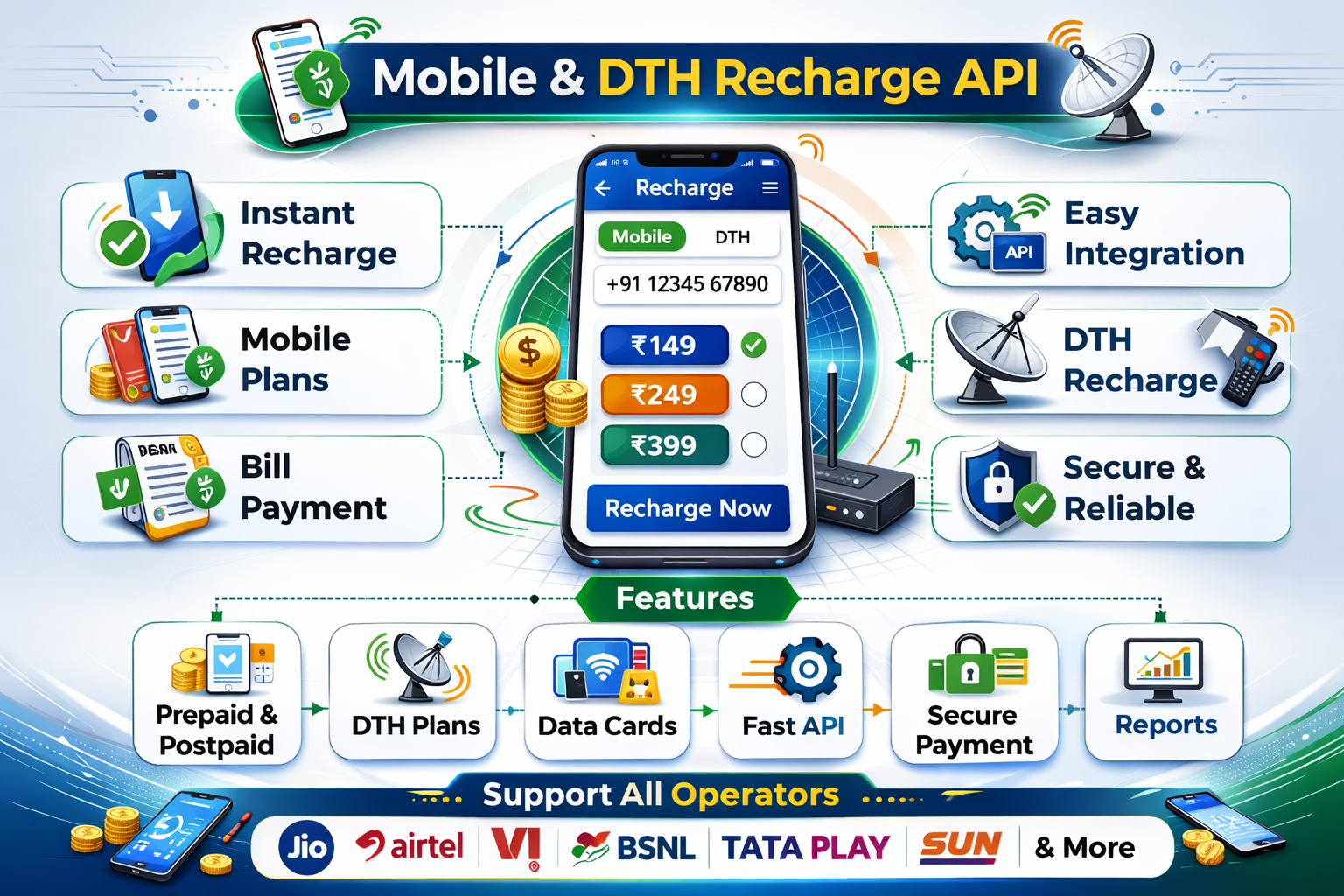 Our API supports all leading telecom and DTH operators across India. This ensures that your customers can recharge any network without limitations.